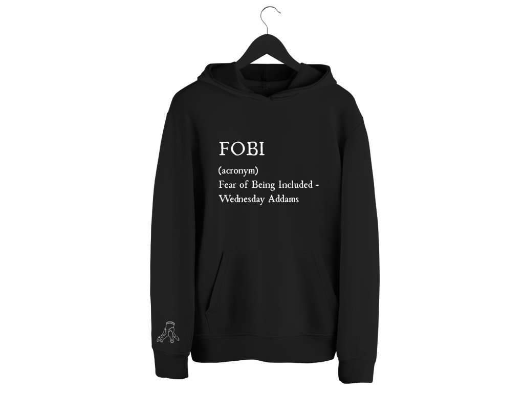 FOBI - Fear of being included je originálna mikina s potlačou, ktorá v sebe spája pohodlie a odvážny humor. Hláška zo seriálu Wednesday dáva mikine jasný charakter a okamžite ju odlíši od bežných kúskov.