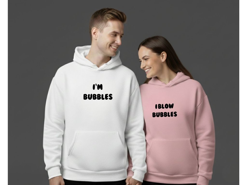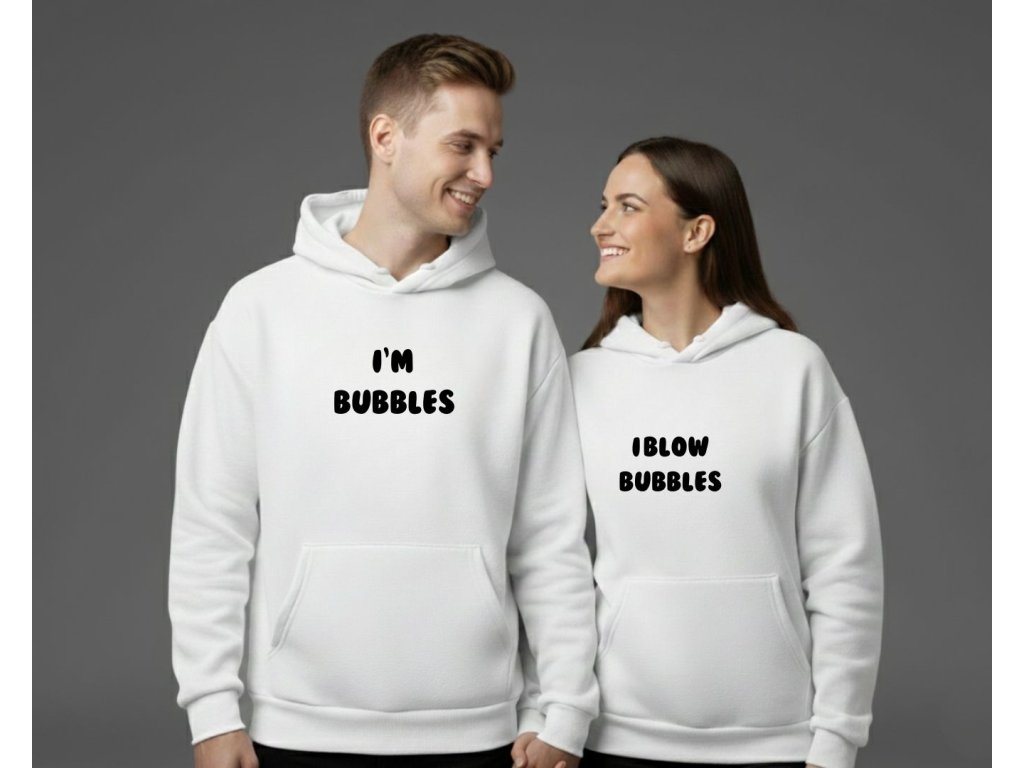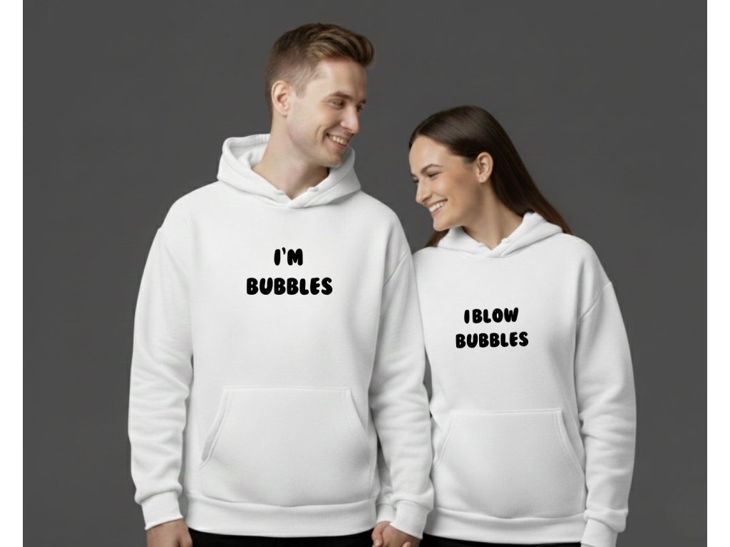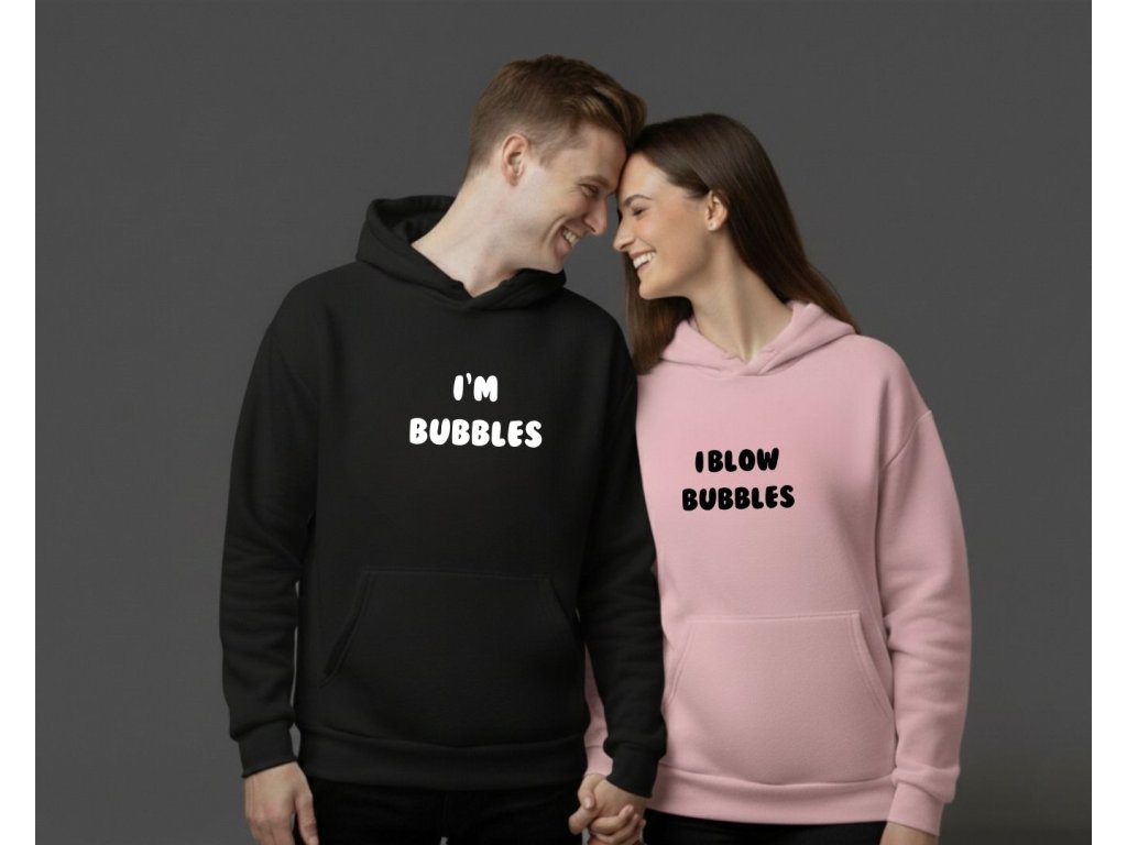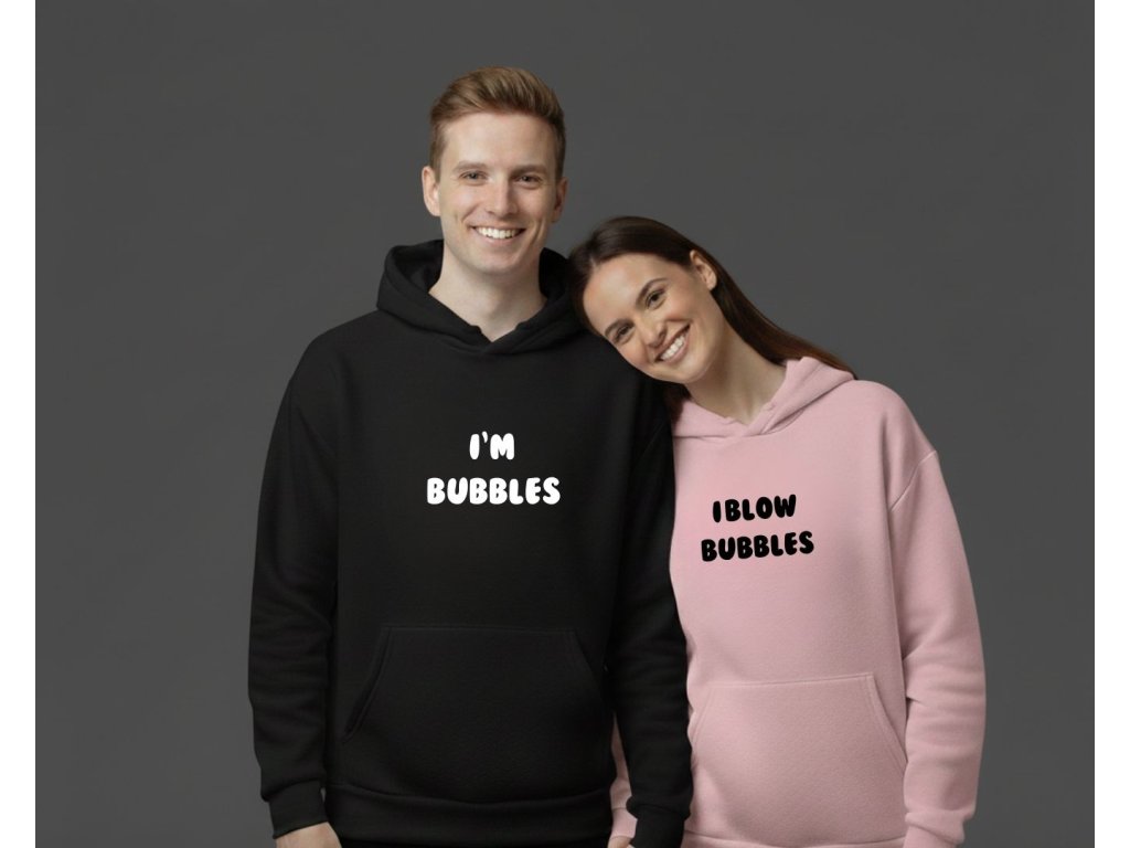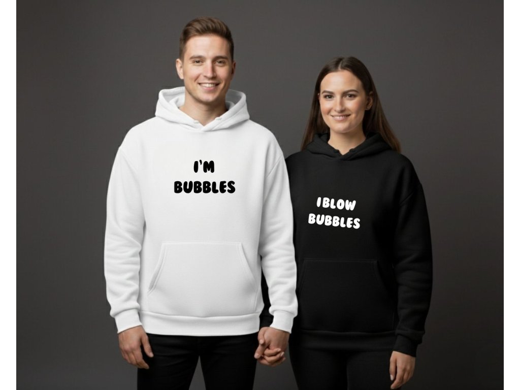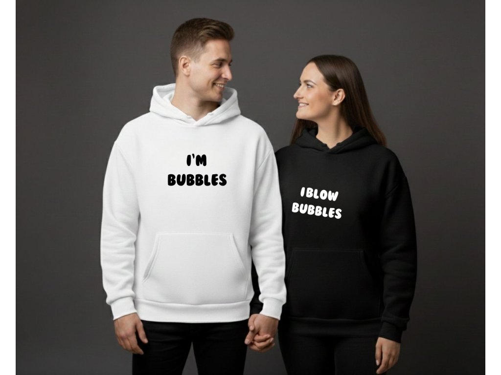 Ste vy ten, kto vnáša do vzťahu vietor a hravosť, alebo ten, kto je roztomilou a nepostrádateľnou súčasťou? Tieto párové mikiny s nápismi "I BLOW BUBBLES" a "I'M BUBBLES" sú vtipným vyhlásením o tom, ako to funguje vo vašom vzťahu!