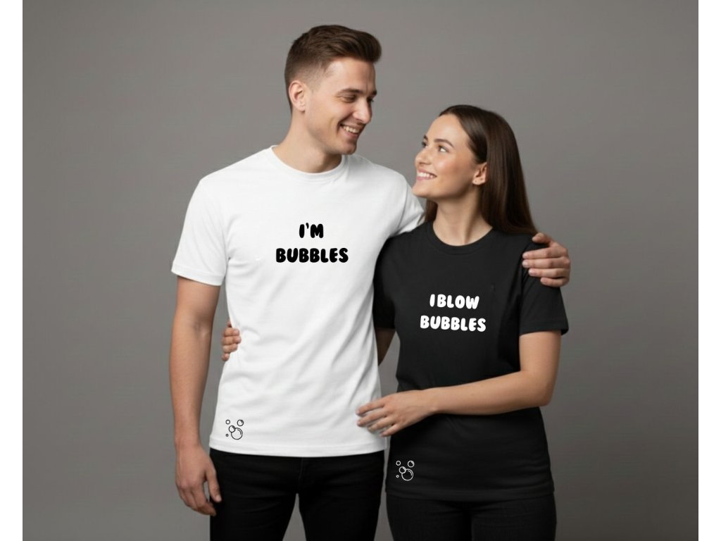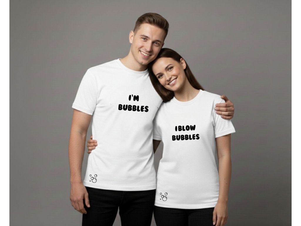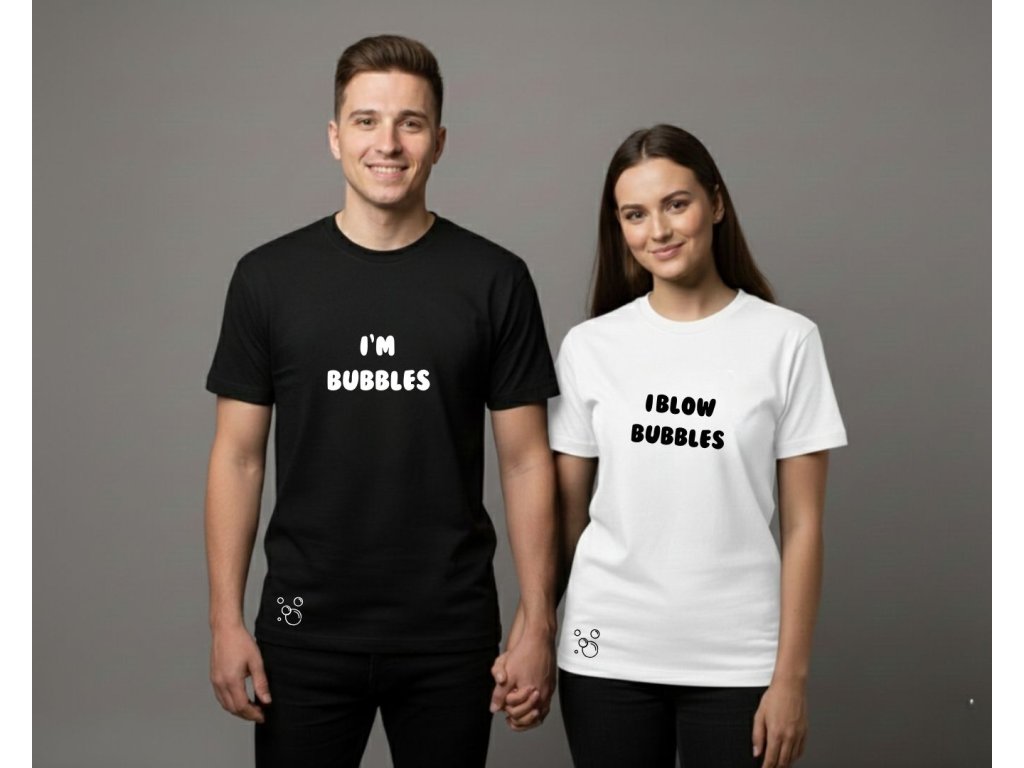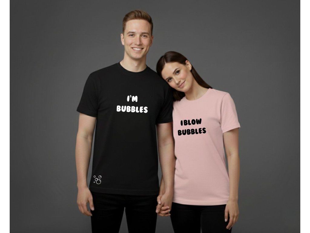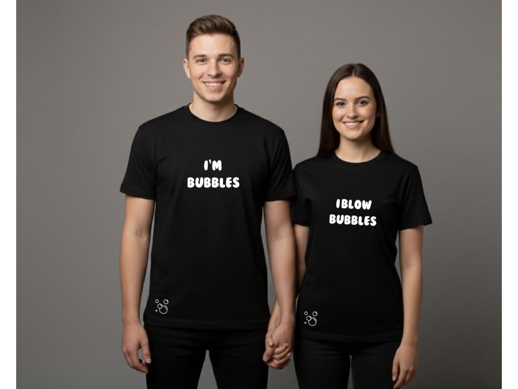 Párové tričká s hravým a vtipným motívom: "I BLOW BUBBLES" a "I'M BUBBLES". Ideálny, ironický a veselý darček pre páry s veľkým zmyslom pre humor a nadhľad! Tričká sú zdobené motívom bubliniek (podobne ako mikina) a sú vyrobené z ľahkej, priedušnej bavlny. Ukážte svetu, že váš vzťah je plný zábavy a občas trochu uletený!