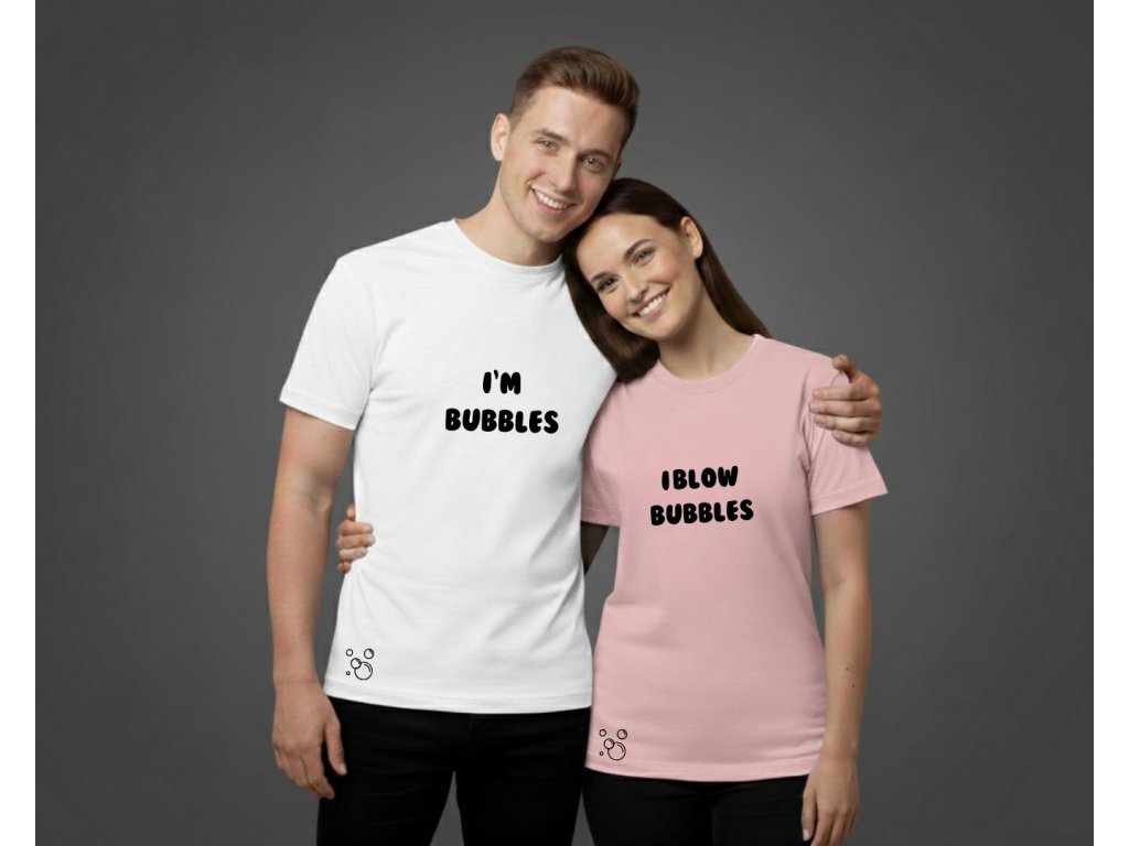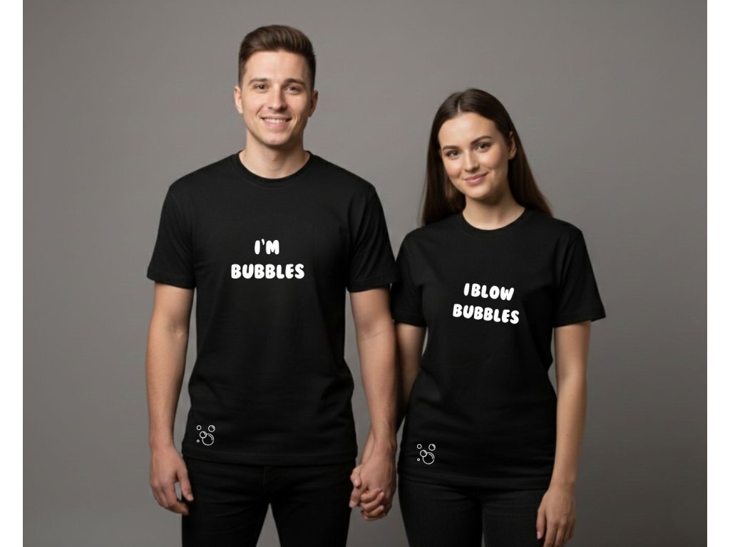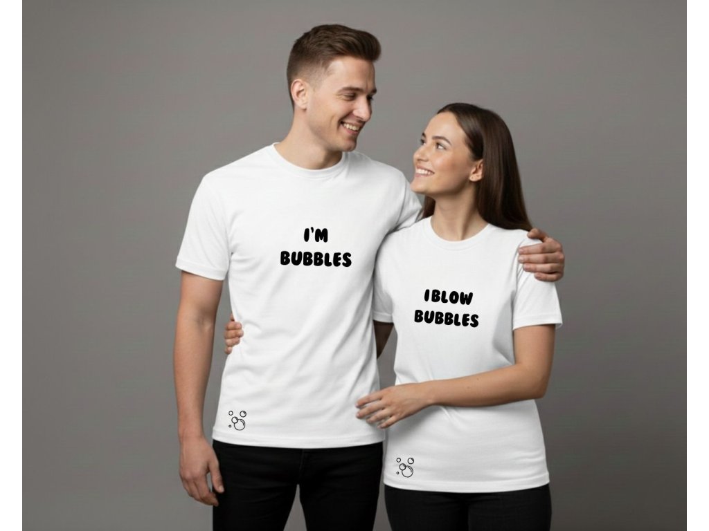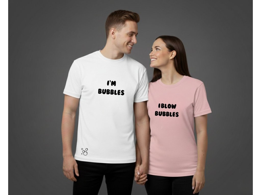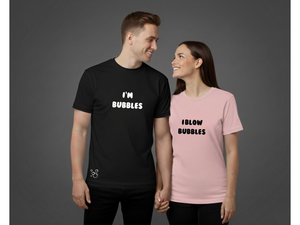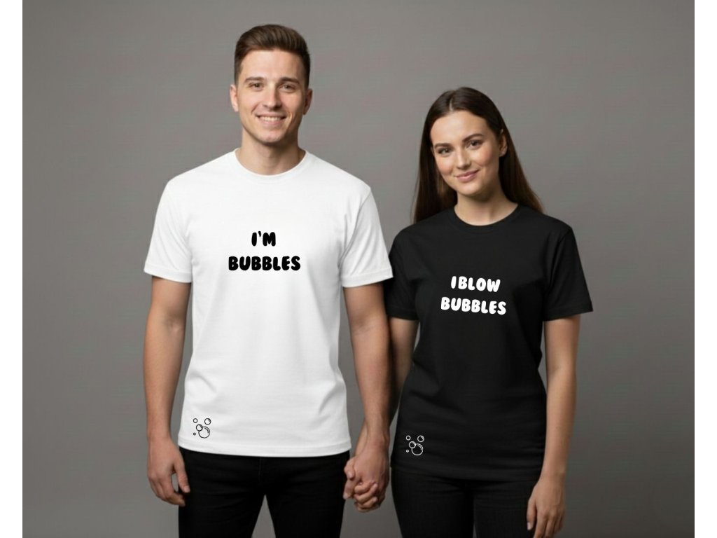 Párové tričká s hravým a vtipným motívom: "I BLOW BUBBLES" a "I'M BUBBLES". Ideálny, ironický a veselý darček pre páry s veľkým zmyslom pre humor a nadhľad! Tričká sú zdobené motívom bubliniek (podobne ako mikina) a sú vyrobené z ľahkej, priedušnej bavlny. Ukážte svetu, že váš vzťah je plný zábavy a občas trochu uletený!