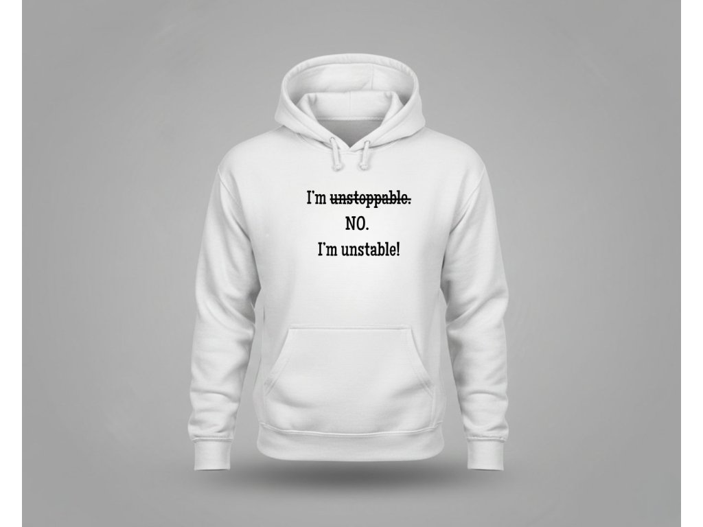 Pánska mikina s vtipným, sebaironickým nápisom: "I'm unstoppable. NO. I'm unstable!". Je to ideálne pre mužov s čiernym humorom, ktorí sa neberú príliš vážne a vedia sa zasmiať na vlastnej "nestabilite". Mikina je vyrobená z mäkkého, hrejivého materiálu a má pohodlný pánsky strih s kapucňou. Je to skvelý vtipný darček pre kamarátov alebo pre seba.