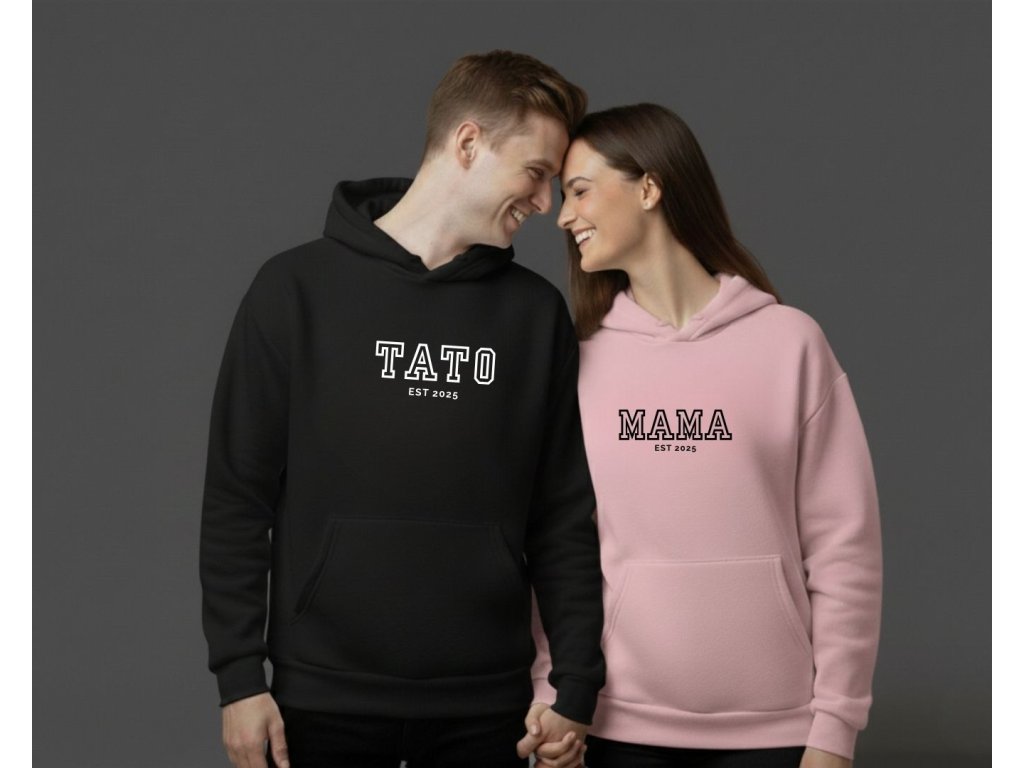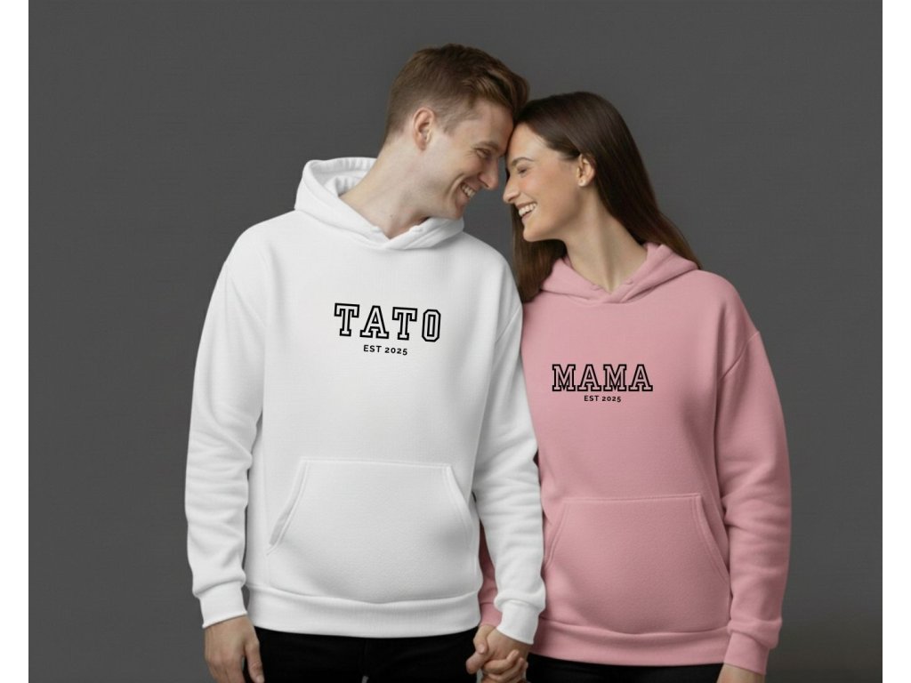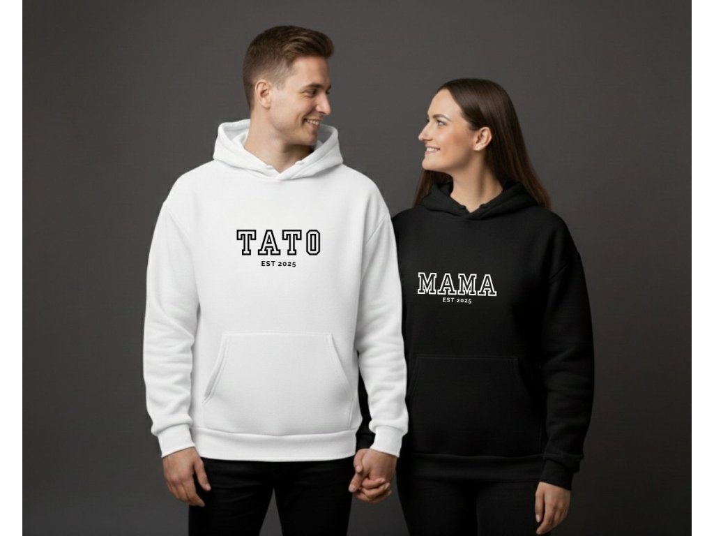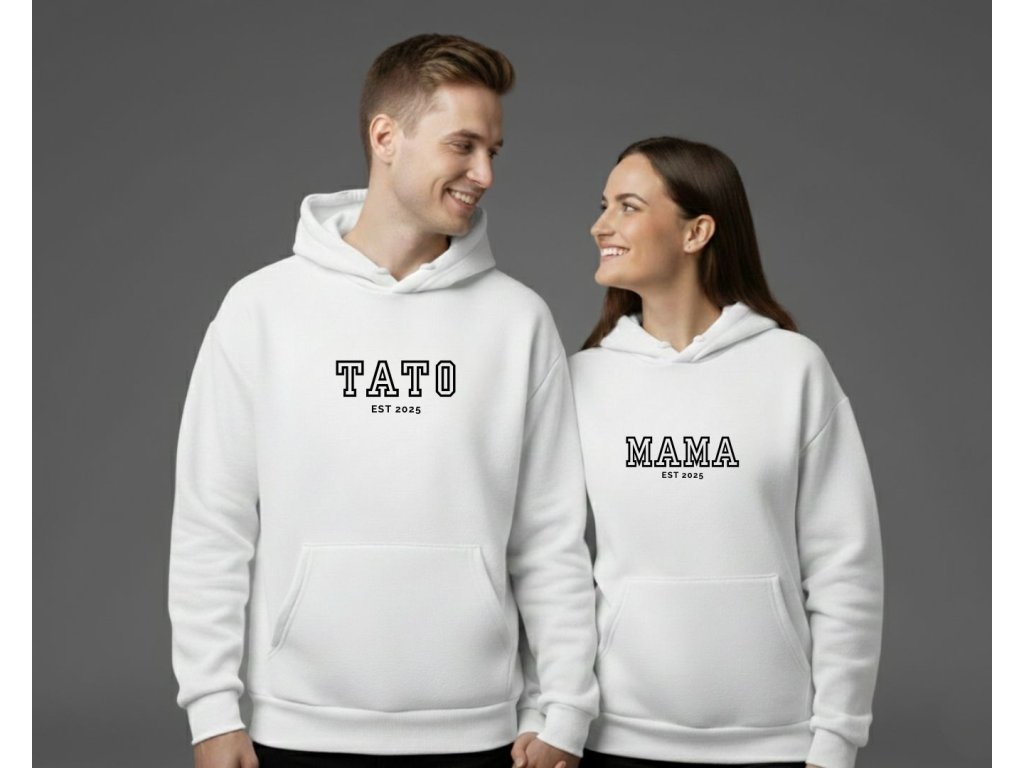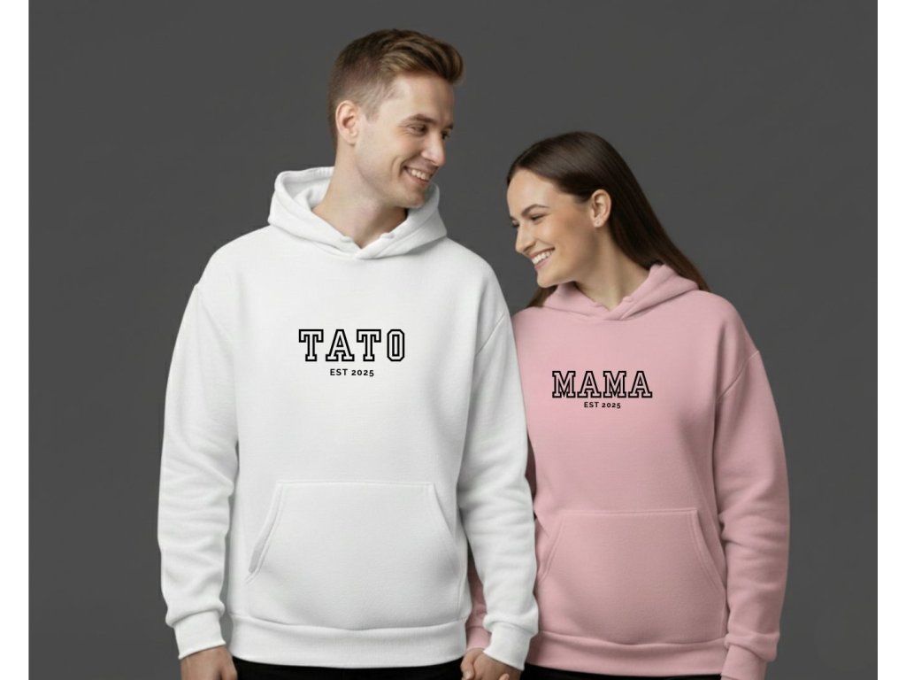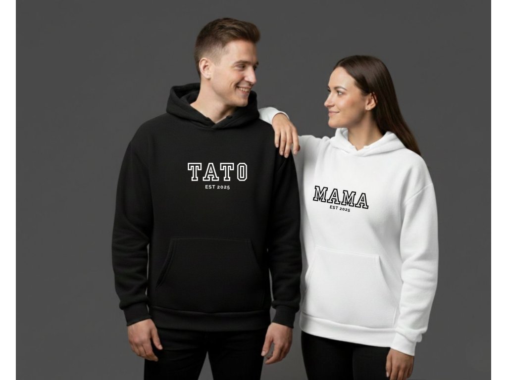 Tieto personalizované párové mikiny s nápisom MAMA a TATO sú nádherný spôsob, ako si pripomenúť a osláviť rok, kedy ste sa stali mamou a otcom. Jednoduchý, ale štýlový dizajn s rokom založenia vašej rodiny z nich robí jedinečný a emocionálne cenný darček.