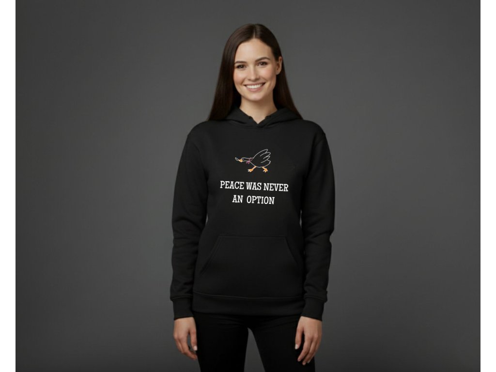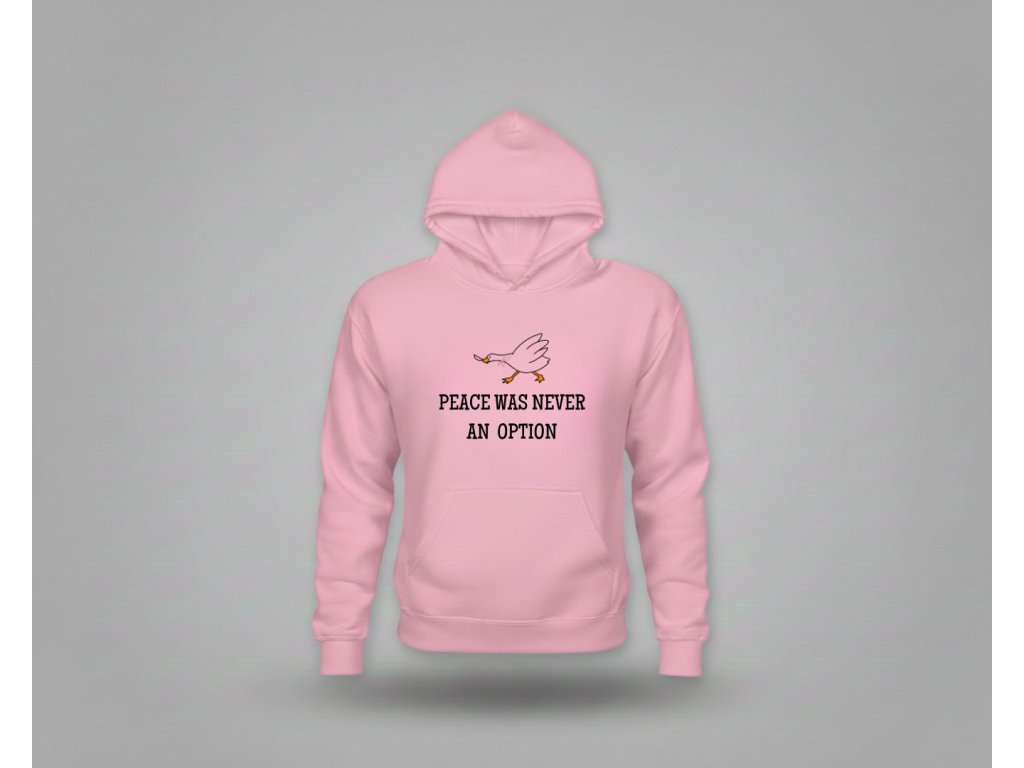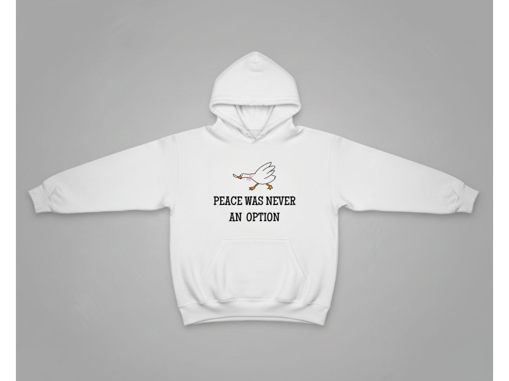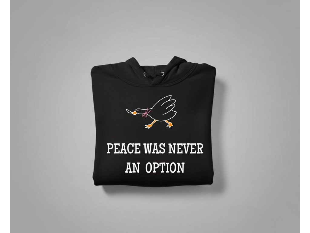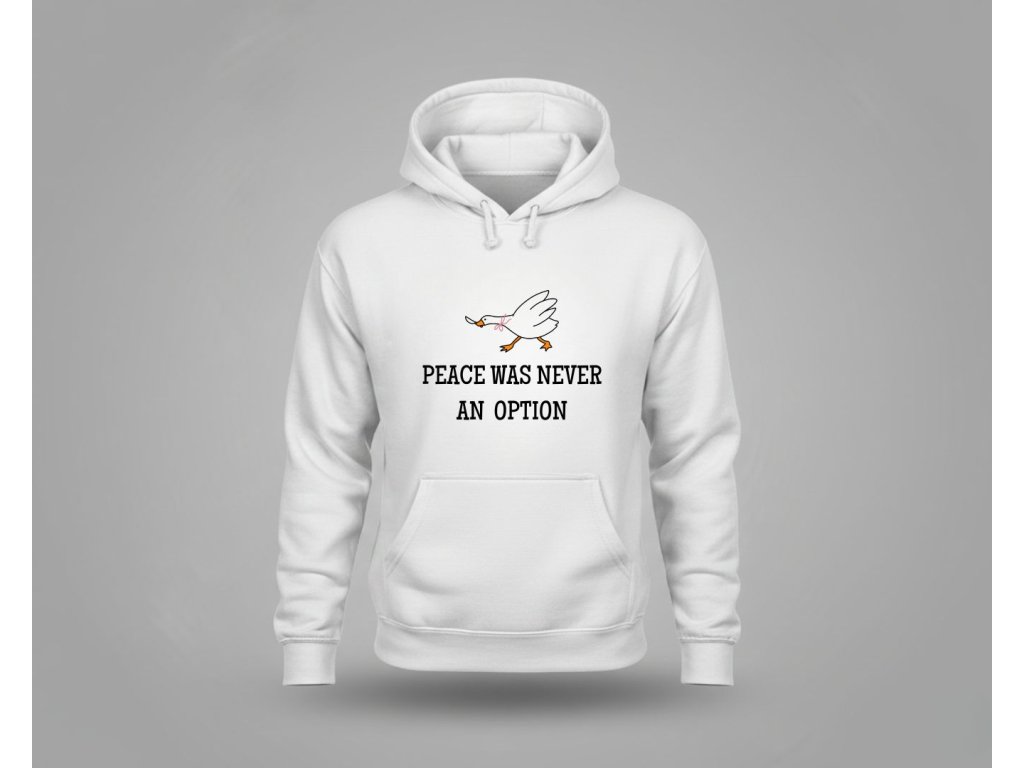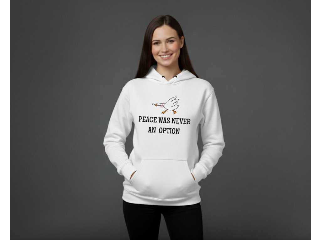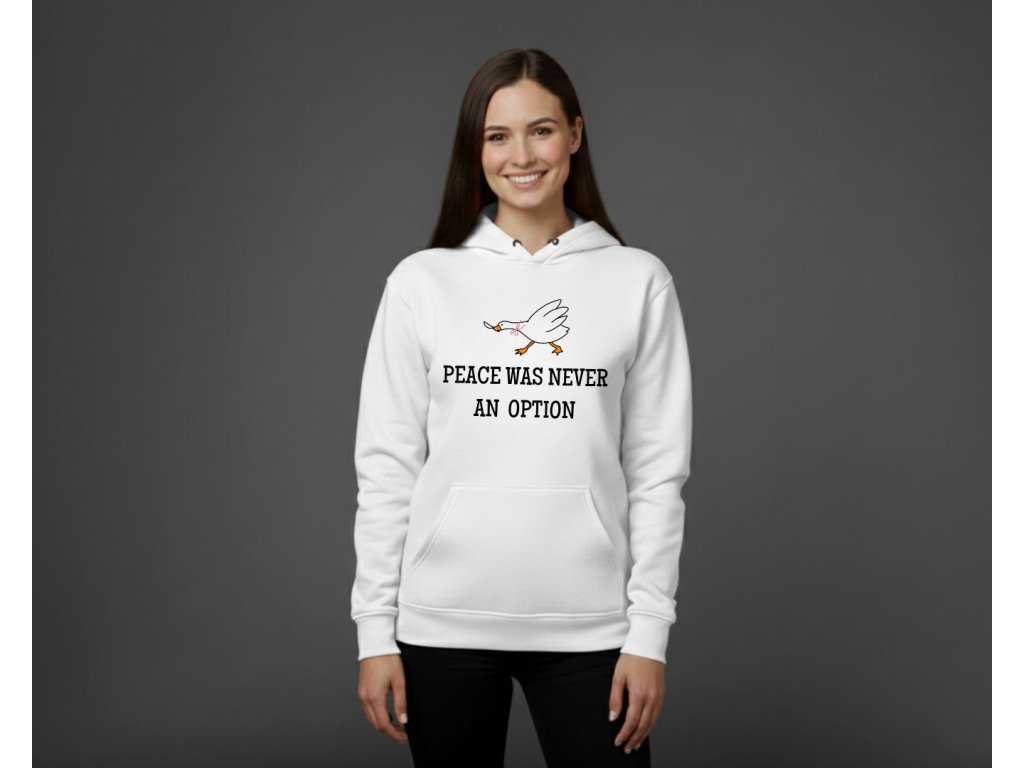 Hľadáš mikinu, ktorá je rovnako silná a nekompromisná ako ty? Táto dámska mikina s kultovým meme nápisom "Peace was never an option" (Mier nikdy nebol možnosťou) je perfektná na vyjadrenie tvojho odhodlania a zmyslu pre humor. Text, ktorý sa stal internetovým symbolom neústupnosti (často spájaný s tou najmenej mierumilovnou husou!), je ideálny pre každú ženu, ktorá si ide za svojím.