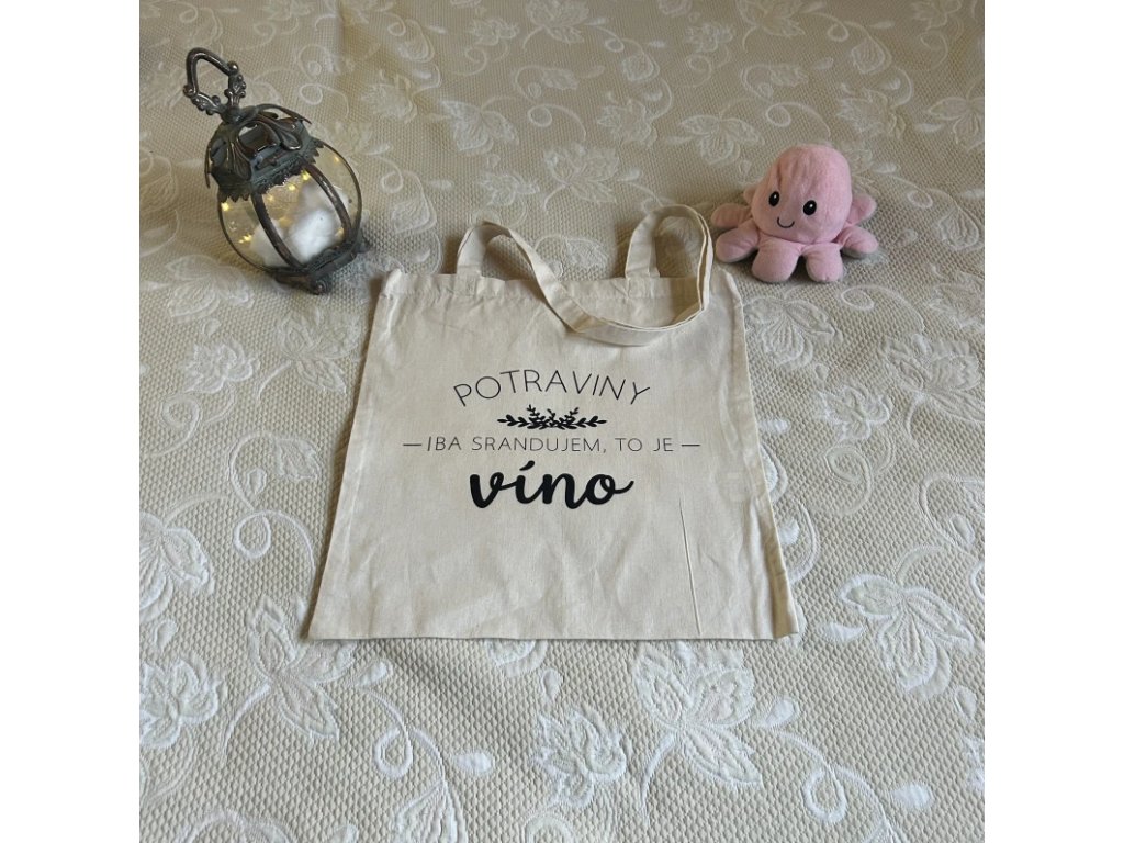 Táto bavlnená taška s potlačou „Potraviny / VÍNO“ je perfektným spojení vtipu a funkčnosti. Vyrobená z odolnej 100 % bavlny, poskytuje dostatok priestoru na nákup aj občasné víno. Vďaka veľkým uchám ju pohodlne prenesieš na ramene aj v ruke. Rozmery 41 × 38 cm zaručujú praktickosť i kompaktnosť. Ideálna ako darček aj štýlový doplnok do domácnosti.