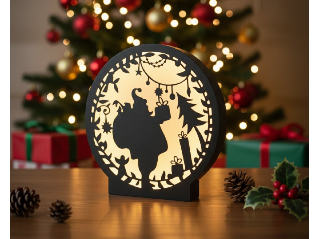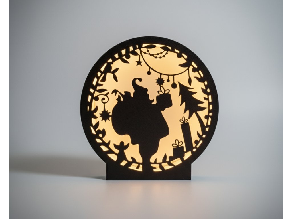 Kruhový dizajn lampy rámuje radostnú, detailnú scénu. V strede je silueta Santa Clausa, ktorý s plným vrecom a zdvihnutým darčekom navštevuje obydlia. Je obklopený jemnými siluetami vianočných reťazí, hviezd, stromčeka a darčekov, čo vytvára bohatý a slávnostný pocit. Celý motív je ohraničený dekoratívnymi vetvičkami, ktoré dodávajú scéne hĺbku lesného prostredia.