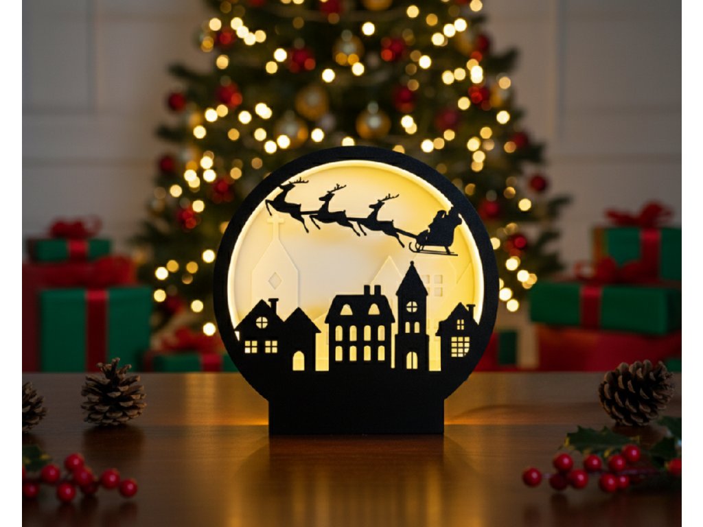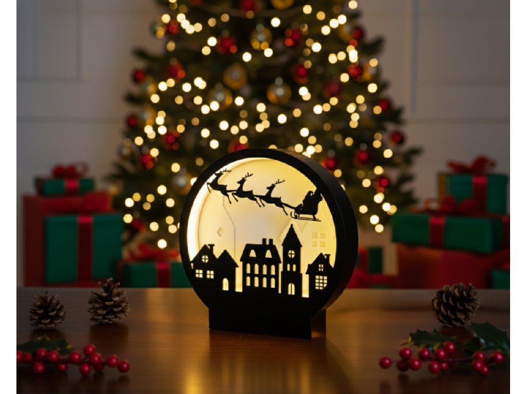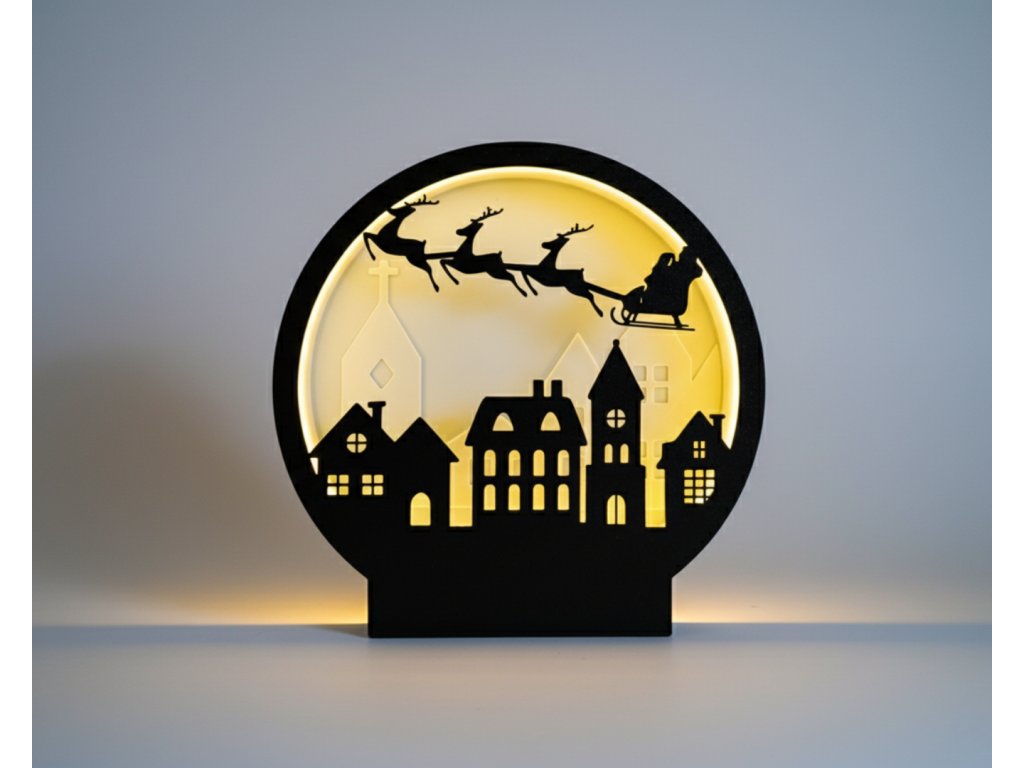 Kruhový dizajn lampy rámuje klasickú zimnú scénu s dôrazom na siluety. V popredí je štýlová a moderná silueta mestečka s jasne osvetlenými oknami, ktoré naznačujú teplo a život vo vnútri. Nad strechami letí Santa Claus (alebo Ježiško) na sánkach ťahaných sobmi, čím vytvára dynamický a veselý kontrast k pokojnému mestskému motívu.