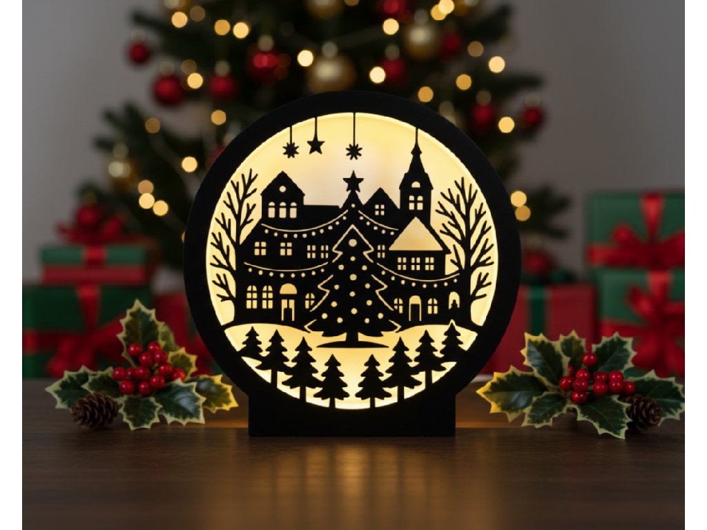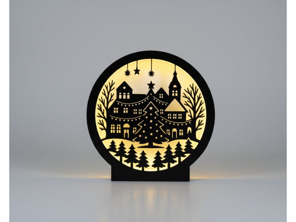 Kruhový dizajn lampy rámuje bohatú a husto detailnú zimnú scénu. Stredobodom je veľký, osvetlený vianočný stromček, ktorý je obklopený architektonickými siluetami tradičných domov s typickými šikmými strechami a vysokou vežou v pozadí. Okolie dopĺňajú siluety stromov bez lístia a hviezdy padajúce zhora, čo dotvára atmosféru tmavej, ale slávnostne osvetlenej noci. Celý motív evokuje pokoj a radosť zo sviatočnej komunity a vidieckeho prostredia.