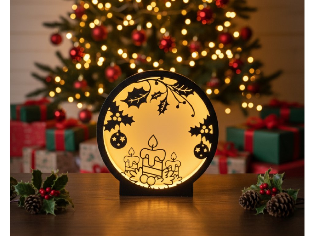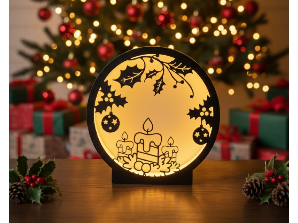 Kruhový dizajn lampy prináša do popredia siluetu troch rôzne veľkých vianočných sviečok (jedna centrálna a dve menšie po stranách), ktoré horia jasným plameňom. Základňa je jemne dekorovaná drobnými lístkami, čo dodáva scéne pocit prirodzenosti. Horná časť je orámovaná zavesenými vetvičkami imela s bobuľami, z ktorých visia aj menšie vianočné gule. Tento motív je kombináciou náboženskej tradície a prírodnej krásy zimy.