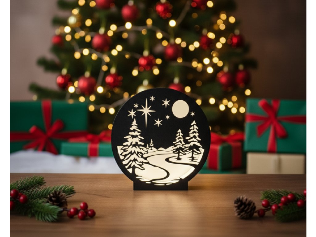 Kruhový dizajn lampy rámuje pokojnú zimnú scénu inšpirovanú hlbokým lesom. V popredí sú siluety zasnežených ihličnatých stromov, medzi ktorými sa kľukatí cesta osvetlená hrejivým svetlom. Nočné nebo dominuje veľká, jasná Betlehemská hviezda obklopená menšími hviezdami a mesiacom, čím evokuje hlboký, mrazivý pokoj Vianoc.